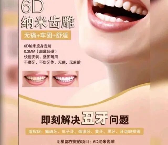 所谓的 "3D/4D/5D/6D" 只是商家炒作的噱头,这种在牙表面粘贴材料改变牙色的方法,实际上是效仿修复治疗里的 " 树脂或瓷贴面 ",只不过不得其法。