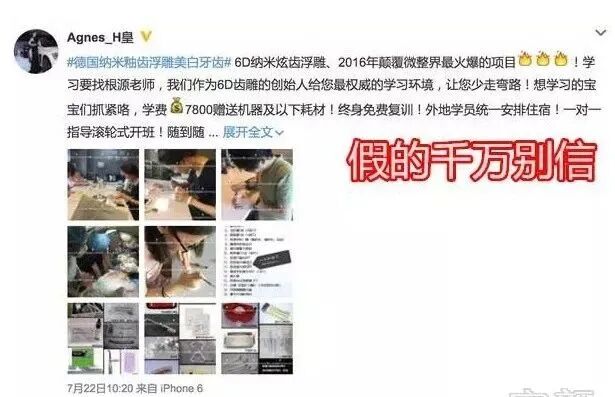 患者来了以后,躺在美容床上,给患者戴个开口器,把嘴撑开,然后用最白的树脂在牙齿表面堆上一层,就算是“无创贴面”。最后再随便抛抛光,就可以和受害者一起自拍发朋友圈,继续钓下个鱼了。